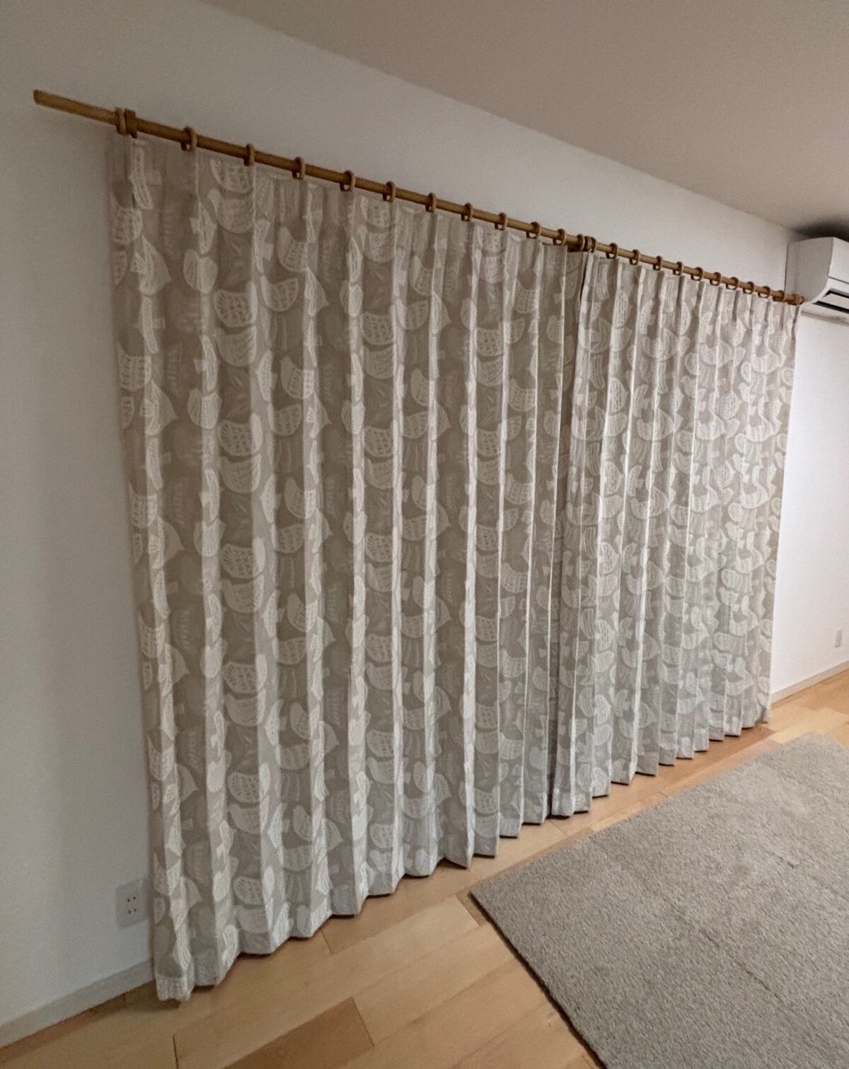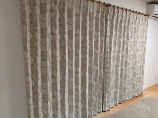 カーテンの裾を長めに床にたらす、ブレイクスタイルと呼ばれるスタイルです。お客様ご持参の真鍮レールとお取り付けしました。